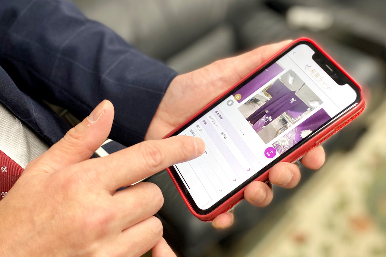 顧客に向けた新たな取組として際立つのが、デジタルクローゼット機能を含んだ「和服らいふ」アプリの開発。顧客が所有している着物・帯・小物をスマホ上のクローゼットで管理でき、いつでもどこでも中身を確認することができるという優れものです。さらに、シーズンが終わった和服を預かり、丸洗いして保管するサービスも開始。この申し込みも同アプリから行うことができます。