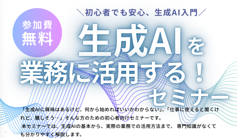「生成AIに興味はあるけど、何から始めればいいかわからない」、「仕事につかえると聞くけれど、難しそう…」そんな方のための初心者向けセミナーです。 本セミナーでは生成AIの基本から、実際の業務での活用方法まで、専門知識が無くても分かりやすく解説します。 セミナー内容 生成AIとは?基礎からや...